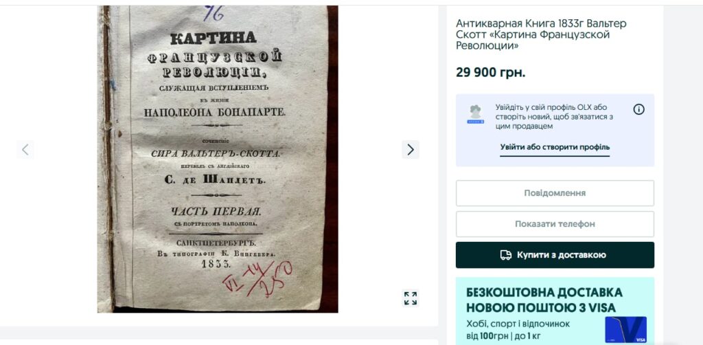 «У 1827 році Вальтер Скотт створив дев’ятитомну біографію Наполеона. Перший том біографії полководця, що став своєрідним вступом до майбутніх діянь Наполеона, присвячений французькій революції. «Картина французької революції» вийшла у російському перекладі в 1833 році, у двох томах, досить швидко стала популярною, а згодом не перевидавалася. З огляду на вік та цінність книги, перед покупкою уважно вивчить усі фотографії та опис дефектів. Готовий надати додаткові фото за запитом. Будь ласка, зверніть увагу: Предмет антикварний і має дефекти», – додає продавець.
