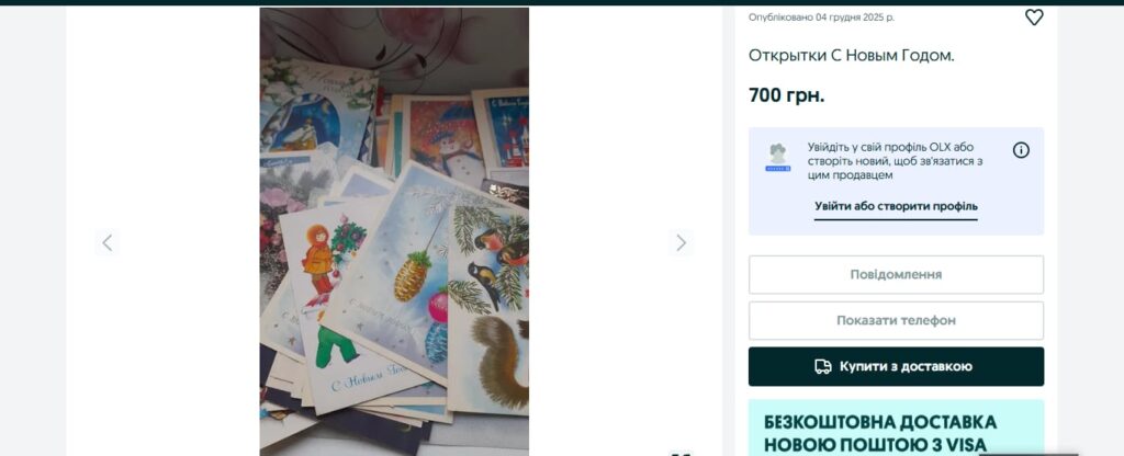 «Продам листівки «З Новим Роком та Різдвом!». Є сучасні та радянські. 19 – великих, 55 – інші», – вказано в оголошенні.