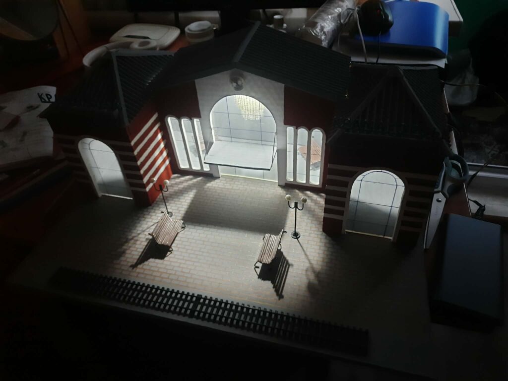 90% матеріалу – картон. Інші елементи робили з зубочисток, дроту, бісеру. Сам напис – металевий, але я використовував фарбу, яка світиться вночі. Всередині Вокзал теж світиться. Для цього я на AliExpress купив спеціальну лампочку, яка світиться від павербанка, тому коли вдома немає світла, діорама нам служить як  нічник.