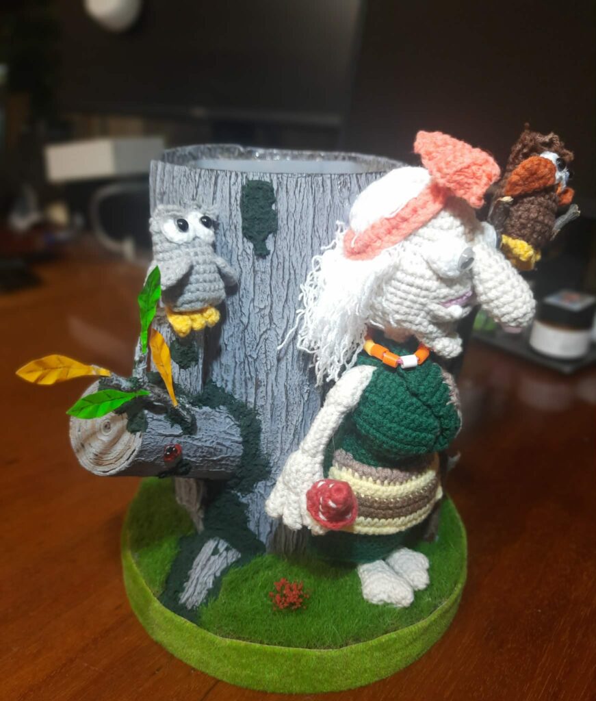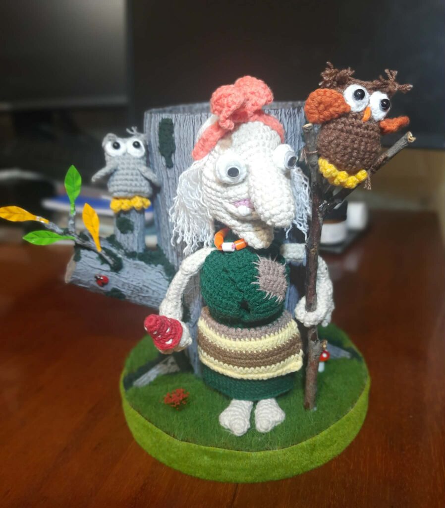 Хотіли у нас Вокзал купити. Я думав справді продати, щоб людям на згадку було, а ми б собі ще один зробили. А син каже: Ні! Це мій Вокзал. Продавати ми його не будемо!”. Загалом виготовлення зайняло чимало часу, близько двох місяців. Ще я робив декоративну вазу, її мене попросила створити знайома. Я спробував, в мене вийшло. Вона хоч й декоративна, квіти туди теж можна ставити. Самому сподобалось, тому я почав далі придумувати. А знайома моя в’яже іграшки гачком, тому вирішила розмістити туди ще Бабу Ягу.
