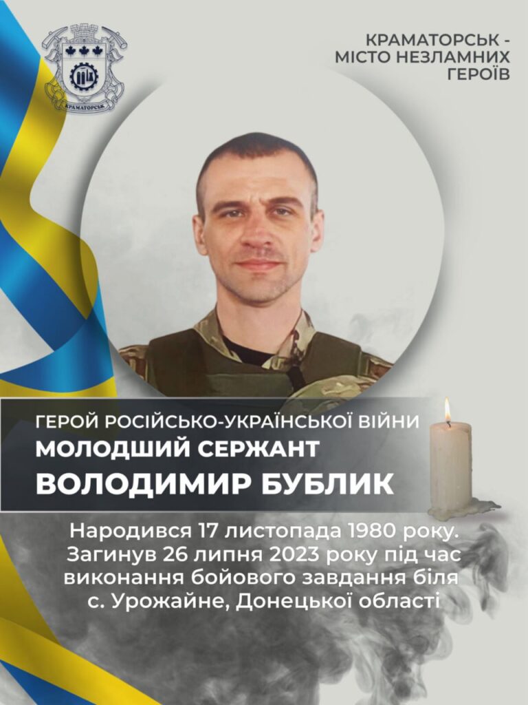 26 липня 2023 року загинув Захисник України, молодший сержант Бублик Володимир Валентинович.