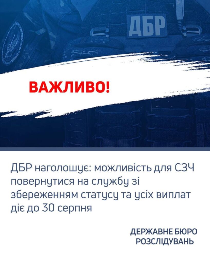 ДБР наголошує: можливість для СЗЧ повернутися на службу зі збереженням статусу та усіх виплат діє до 30 серпня