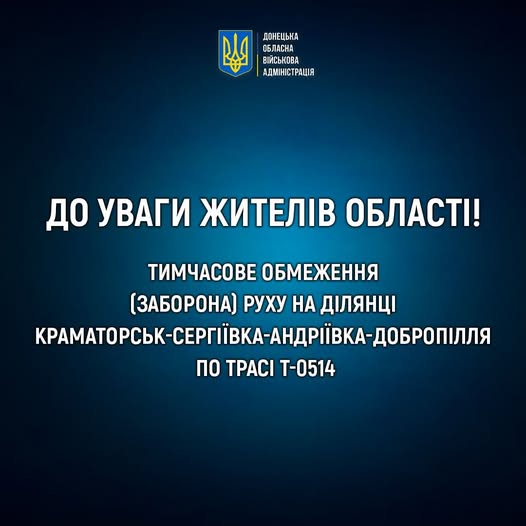 З 16 липня 2025 року вводиться тимчасове обмеження (заборона) для громадян, іноземців та осіб без громадянства, а також руху цивільних транспортних засобів на ділянці Краматорськ – Сергіївка – Андріївка – Добропілля автомобільної дороги загального користування державного значення Т-05-14 Добропілля – Лиман км 5+850 – км 49+615.