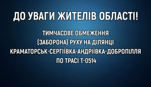 З 16 липня 2025 року вводиться тимчасове обмеження (заборона) для громадян, іноземців та осіб без громадянства, а також руху цивільних транспортних засобів на ділянці Краматорськ – Сергіївка – Андріївка – Добропілля автомобільної дороги загального користування державного значення Т-05-14 Добропілля – Лиман км 5+850 – км 49+615.