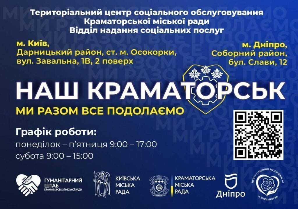 Для більш зручної комунікації територіальний центр соціального обслуговування, відділення соціальних послуг “НАШ КРАМАТОРСЬК” з філіалами у Києві та Дніпрі має власний телеграм канал – https://t.me/hub_nash_kramatorsk.