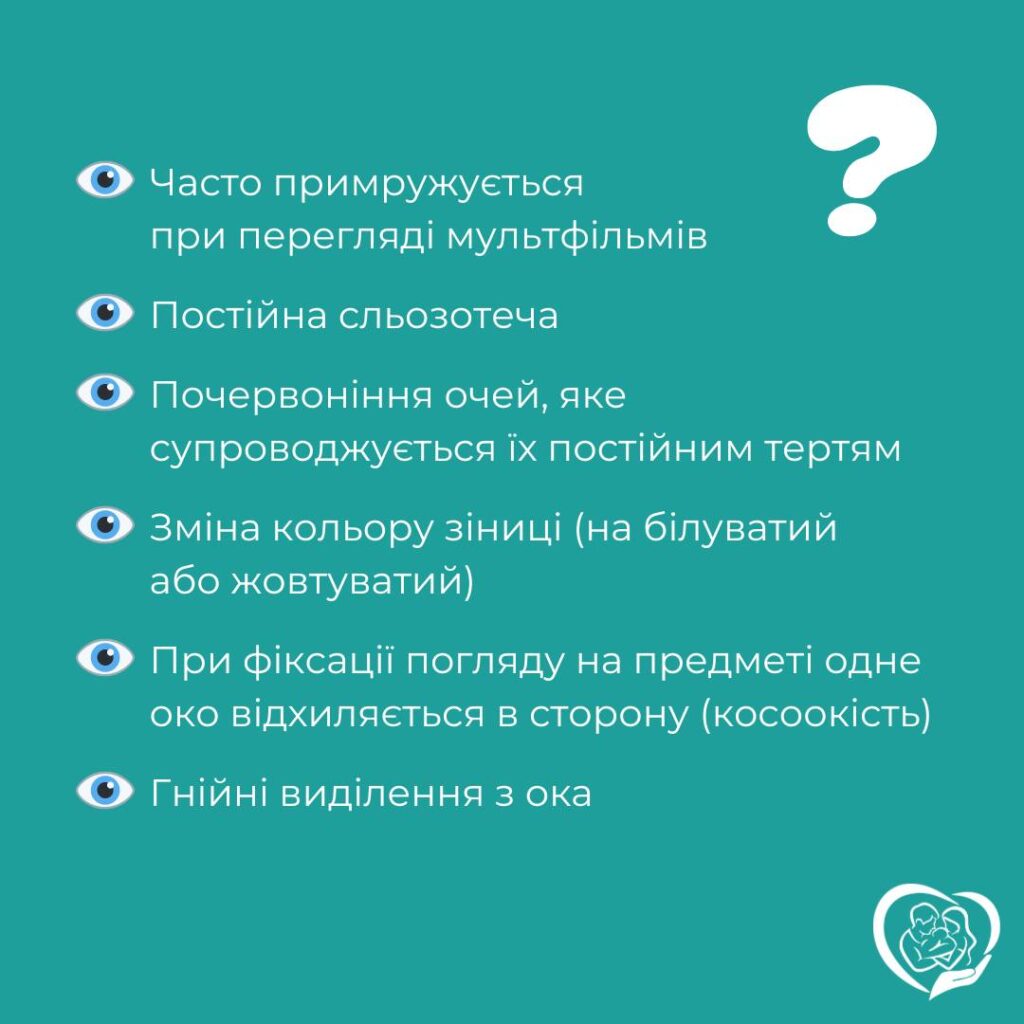 Батькам постійно треба спостерігати за станом очей. Поява будь-яких виділень, зміни кольору, зміни положення ока — це вже тривожний дзвіночок. Найчастіше у дитячому віці виникають розлади акомодації (міопія або гіперметропія). Ознаки цього ви можете помітити також при спостереженні за дитиною: вона сідає ближче до телевізора, аби побачити мультик, або коли ви вказуєте їй на якийсь предмет здалеку, то дитина сильно примружується.