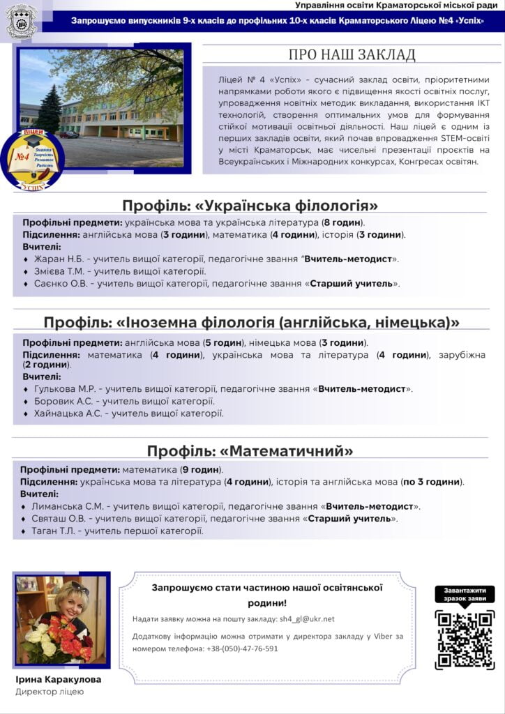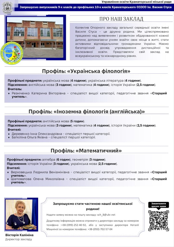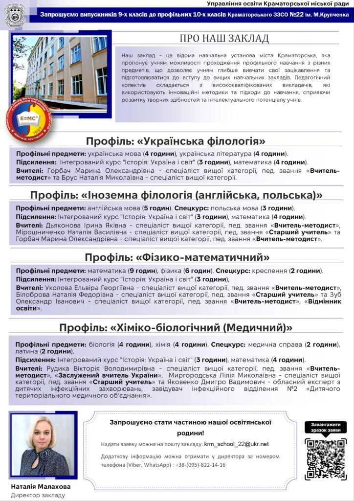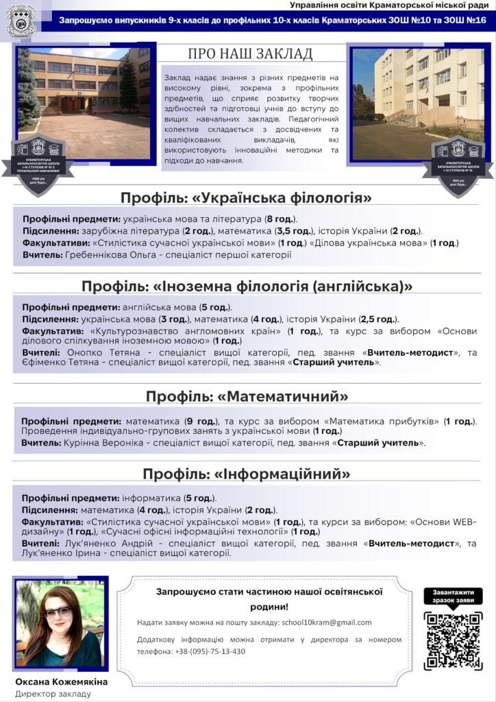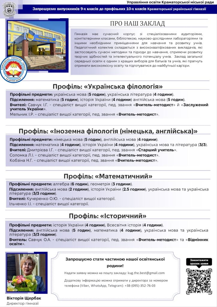 У новому навчальному році краматорські середні навчальні заклади відкривають свої двері для учнів, які закінчили 9 клас, запрошуючи їх продовжити освітній шлях. З метою забезпечення якісної та сучасної освіти, школи міста пропонують широкий спектр спеціалізованих програм та профілів навчання, які відповідають різним інтересам і потребам молоді. У цьому матеріалі журналісти «Рro100Media» познайомлять з профільними освітніми закладами Краматорська та процедурою вступу до них.
