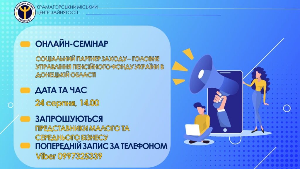 24 серпня о 14:00 консультанти роботодавців Краматорського міського центру зайнятості проведуть онлайн-семінар для представників малого та середнього бізнесу. Соціальний партнер заходу – Головне управління Пенсійного фонду України в Донецькій області.