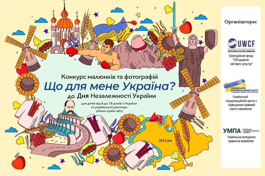 Благодійний фонд «Об’єднання світових культур» United World Cultures Foundation / UWCF, Український координаційний центр з підвищення правової освіти населення та Українська молодіжна правнича асамблея проводять ІІІ Всеукраїнський конкурс малюнків та фотографій «Що для мене Україна?», приурочений до Дня Незалежності України.