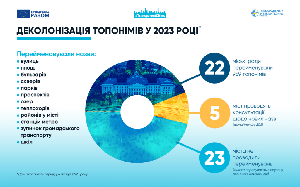 Із найсвіжіших даних — за перші пів року 2023 року 22 міські ради перейменували 959 топонімів. Ще у 5 містах (Коломия, Миколаїв, Херсон, Черкаси, Чернівці) тривають консультації з громадськістю щодо нових назв — планують перейменувати щонайменше 205 топонімів.