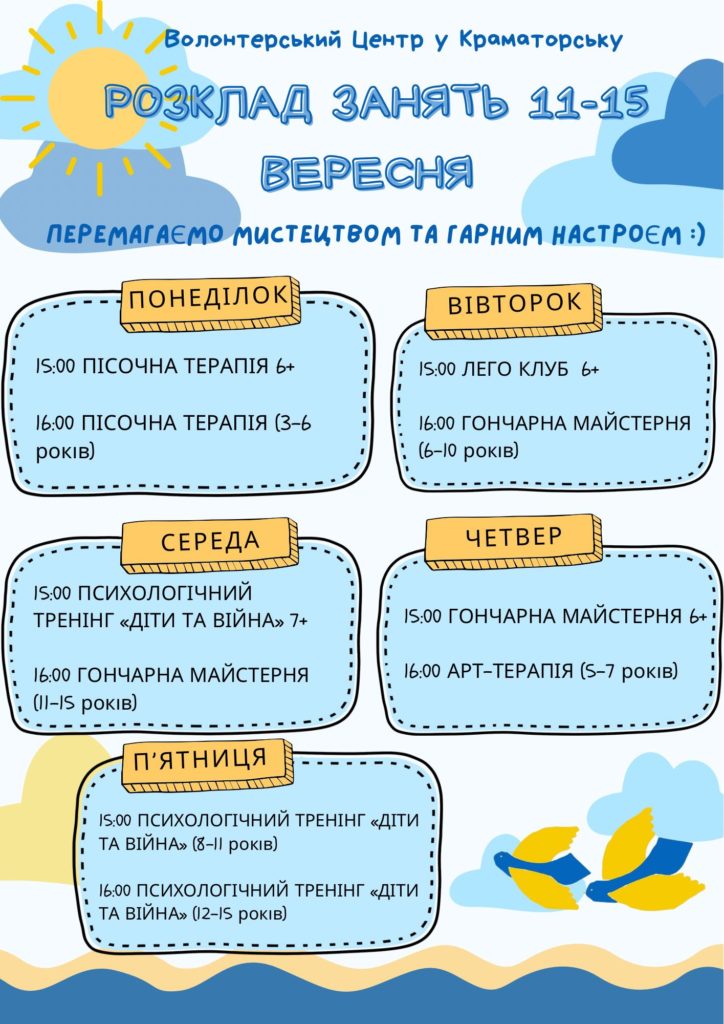 Волонтерський центр у Краматорську – це проєкт благодійного фонду «Хатіко UA». Працюють з вересня минулого року. Тут чекають дітей від 6 років на заняття у LEGO-клуб, гончарну майстерню та на пісочну терапію.