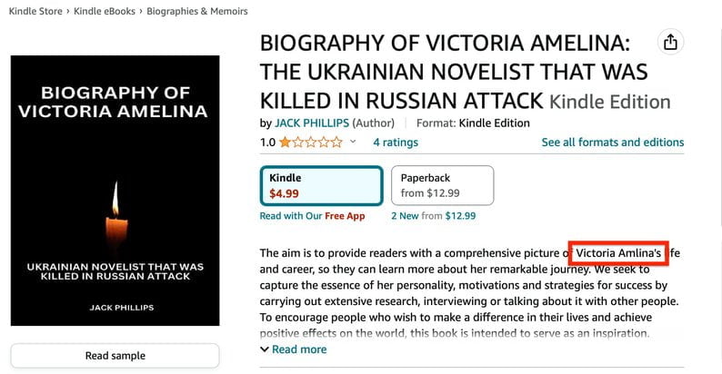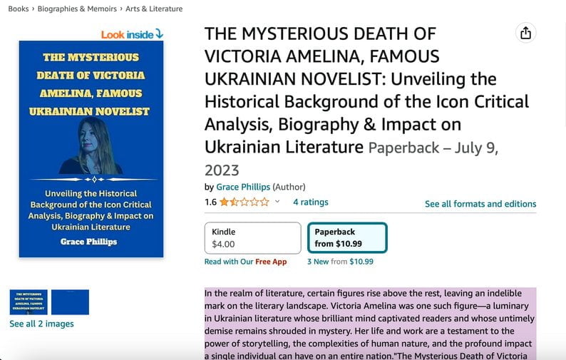 Ще одна книжка про Вікторію має назву “Біографія Вікторії Амеліної: української письменниці, яка була вбита під час російської атаки” (Biography of Victoria Amelina: the Ukrainian novelist that was killed in Russian Attack). Вона підписана іменем Джека Філліпса і коштує $12.99 (майже 480 гривень).