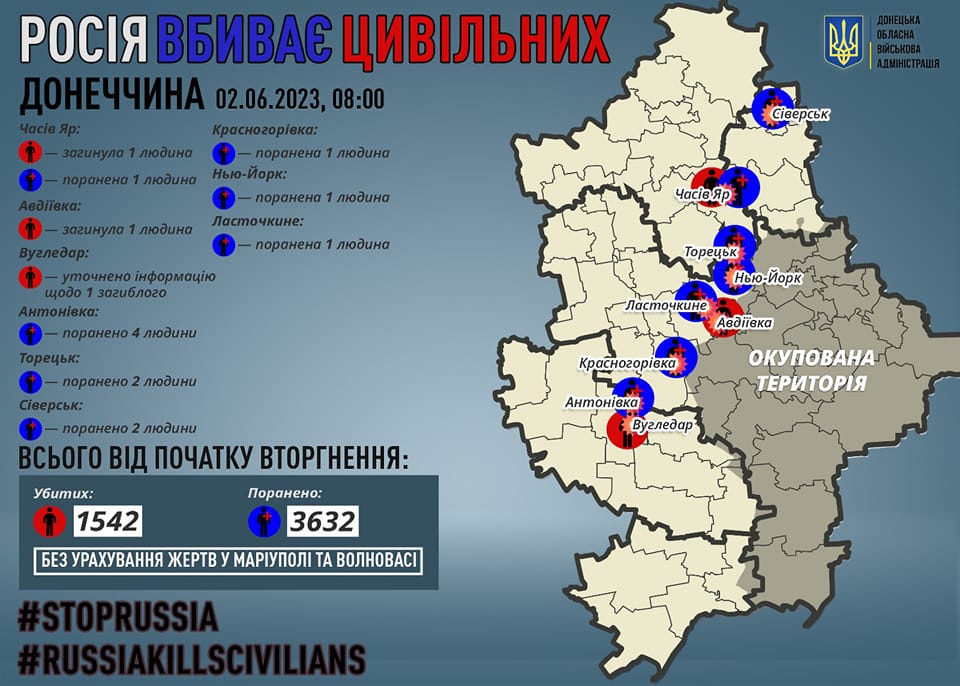 Нагадаємо, 31 травня обстрілів зазнали 14 населених пунктів Донеччини. Постраждало цивільне населення. Російські війська атакували міста Авдіївка, Костянтинівка, Красногорівка, Слов’янськ, Торецьк, Часів Яр, смт Велика Новосілка, Удачне, Курахівка, села Богоявленка, Іванопілля, Карлівка, Ласточкине, Привілля.