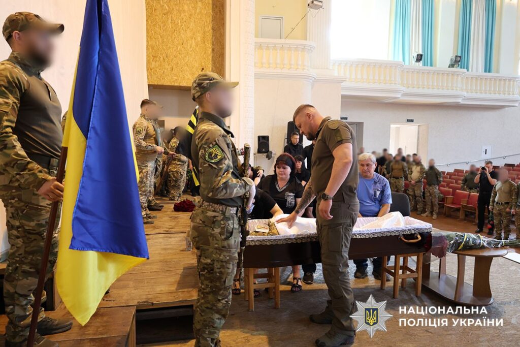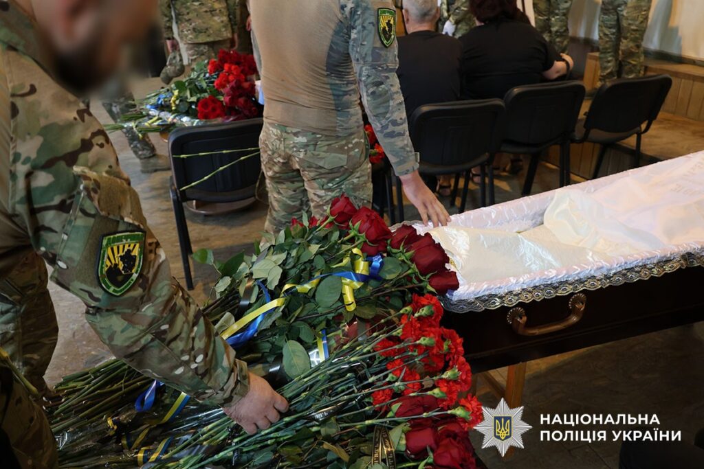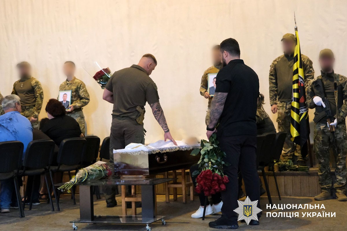 Під час прощання з героями начальник ГУНП в Донецькій області Руслан Осипенко передав родинам полеглих прапори батальйону та бойові шеврони – як символ доблесті та самопожертви їхніх найрідніших людей.