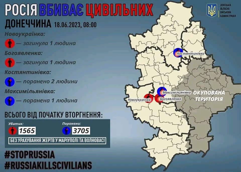 “За 17 червня росіяни вбили 2 жителів Донеччини: у Новоукраїнці та Богоявленці”, – зазначив Павло Кириленко.