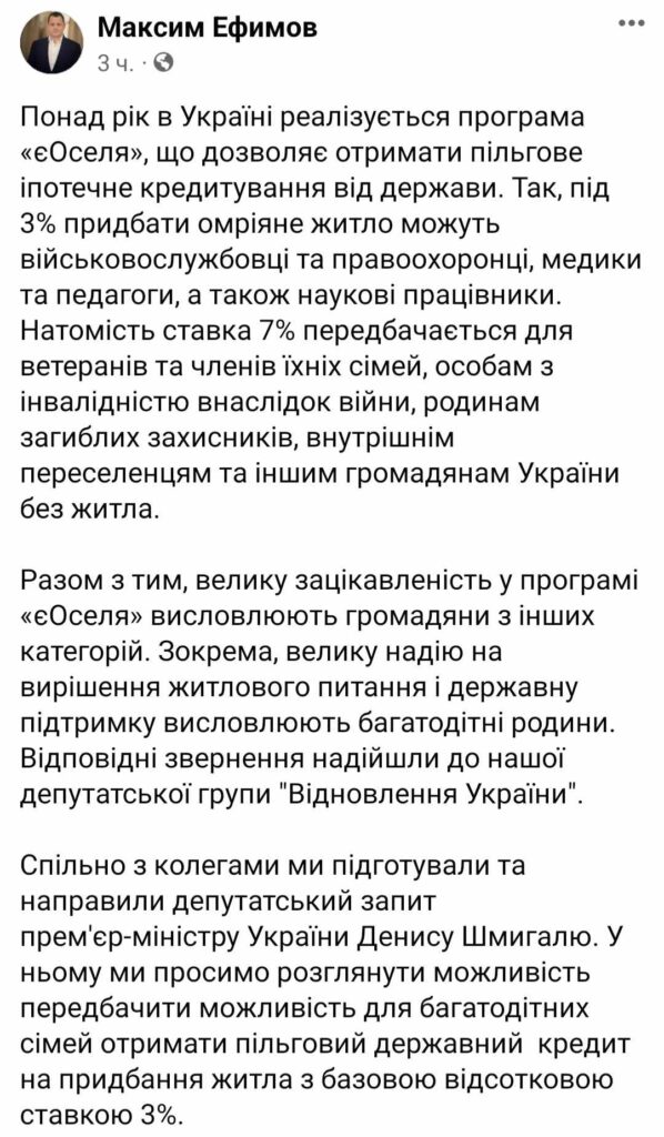 “Спільно з колегами ми підготували та направили депутатський запит прем’єр-міністру України Денису Шмигалю. У ньому ми просимо розглянути можливість передбачити можливість для багатодітних сімей отримати пільговий державний кредит на придбання житла з базовою відсотковою ставкою 3%”, – зазначив Максим Єфімов.