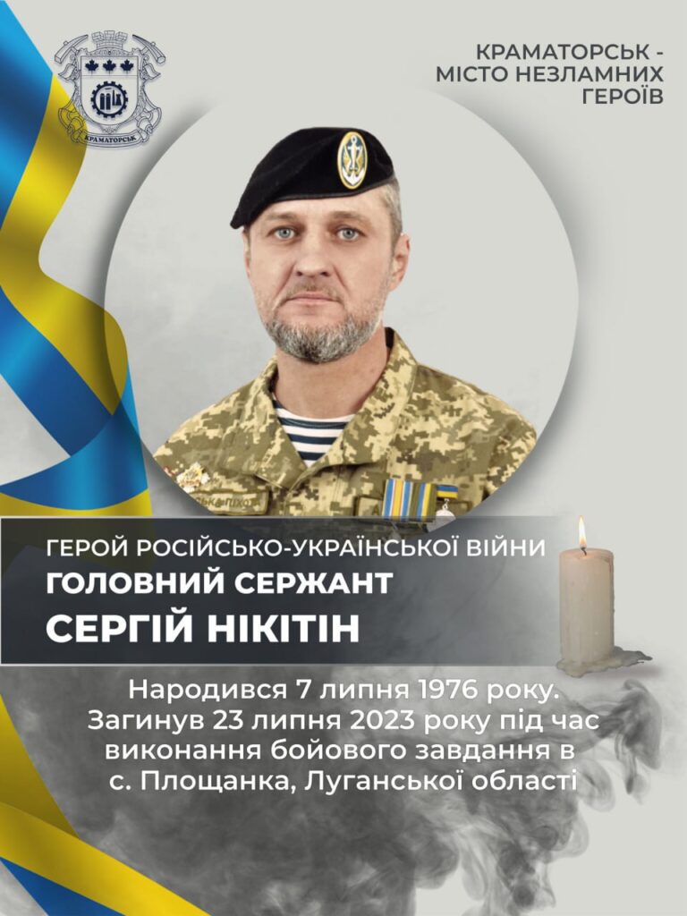 23 липня 2023 року загинув Захисник України, головний сержант Збройних Сил Нікітін Сергій Юрійович (позивний “Донбас”).