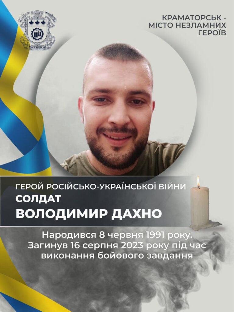 У цей день Краматорськ втратив Захисників України Дахно Володимира Олександровича (16.08.2023) та Радомського Юрія Сергійовича (16.08.2024).