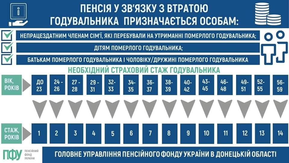 Одним з ключових критеріїв при призначенні пенсії є наявність страхового стажу у годувальника на день його смерті від 1 до 15 років. Тривалість страхового стажу залежить від віку годувальника на момент смерті. Таким чином, чим більший страховий стаж, тим більшу пенсію можуть отримати члени його сім’ї. Ця пенсія призначається дружині (чоловіку), дітям та батькам годувальника, які перебували на його утриманні.