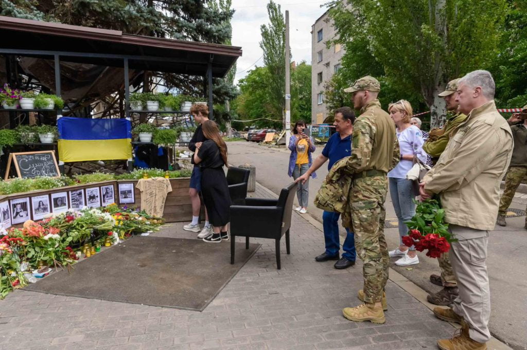 Петро Порошенко відвідав імпровізований меморіал, що з’явився на місці колишнього кафе, де сталася трагедія. Він поклав квіти до меморіалу та вшанував пам’ять загиблих. Запалені свічки і квіти, розташовані біля фотографій дітей, жінок та чоловіків, стали символом пам’яті і скорботи за невинними життями, які були забрані в той фатальний день.