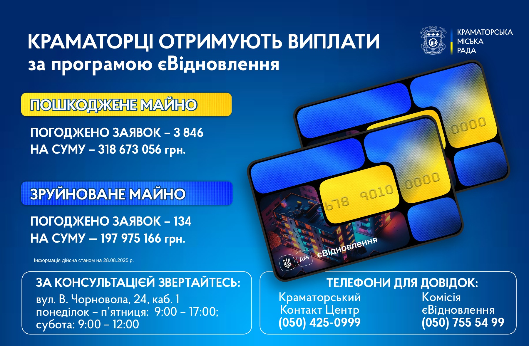Краматорці, чиє житло пошкоджене, продовжують подавати відповідні заяви. Прийнято позитивних рішень по 3 846 заявам на загальну суму — 318 673 056 грн.