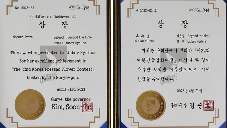 Міжнародний конкурс пресованих квітів у Південній Кореї проходить щороку. Майстриня, каже, що бере в ньому участь вже не вперше. У 2020 та 2022 роках її роботи з берести “Стара церква” та “Мрії” були відзначені у номінації “Спеціальний приз”.