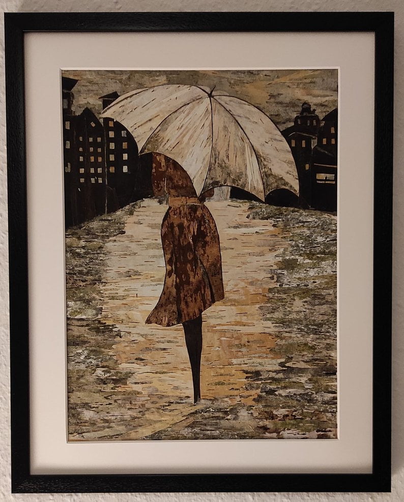 Ця картина, де зображена дівчина з парасолькою, називається “Поза часом”. Для її створення, ділиться художниця, вона брала лише природні матеріали.