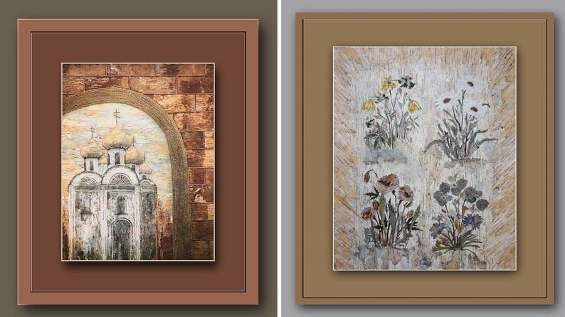 “Картина створена з берести. Будинки чорного кольору зі шкірки банана. Фарби натуральні, без домальовок”.