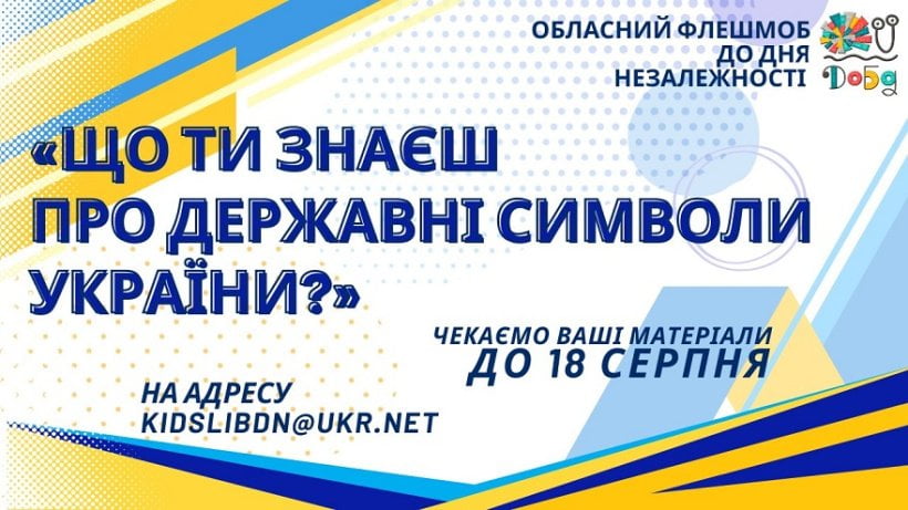 До Дня Незалежності України Донецька обласна бібліотека для дітей за підтримки Донецької обласної державної адміністрації оголошує про початок обласного флешмобу «Що ти знаєш про державні символи України?».