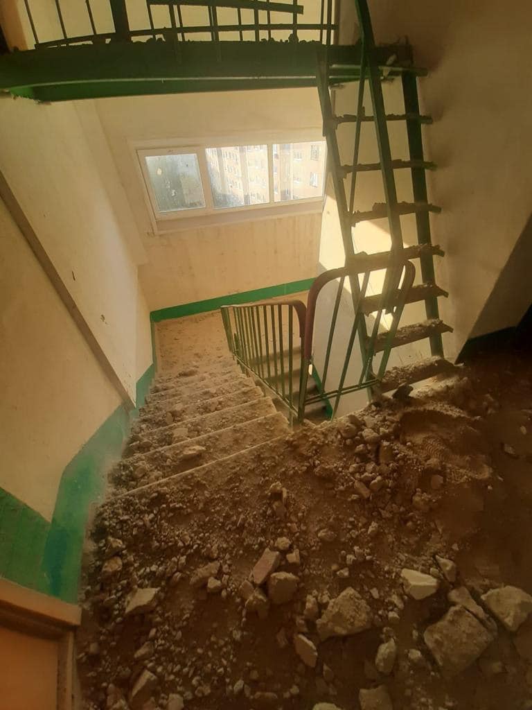 Ліфтове обладнання було пошкоджено, декілька під’їздів було відключено від електропостачання, але наразі його відновили.