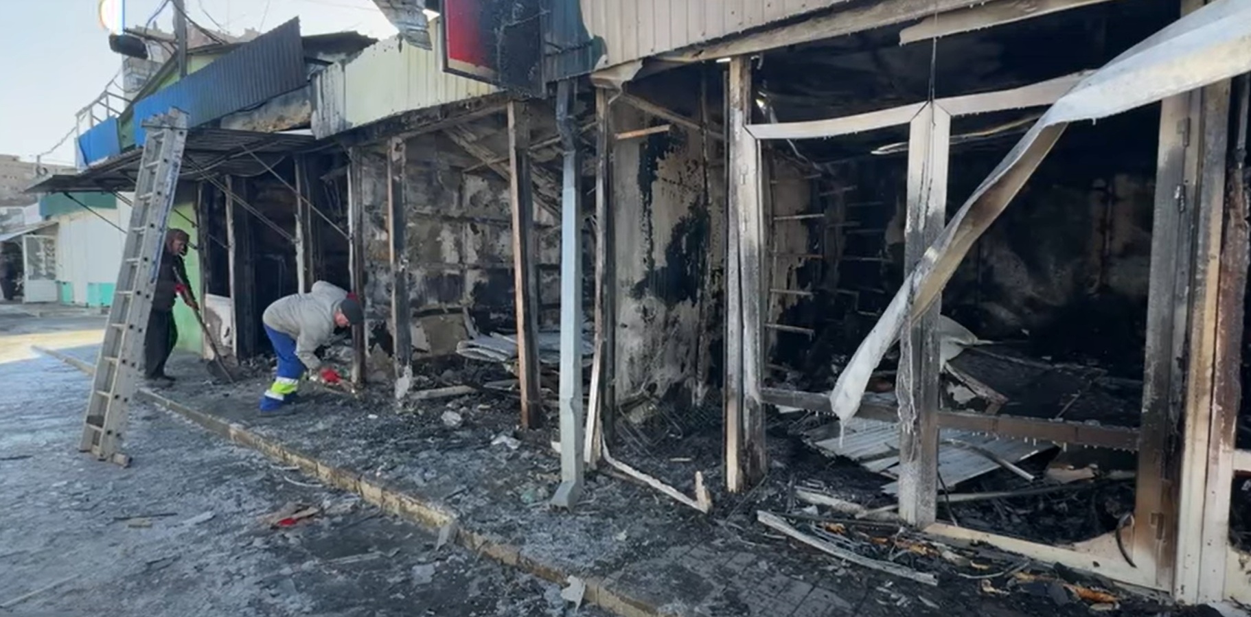На ранок після обстрілу і пожежі ринок у Краматорську працює. Власники пошкоджених крамничок прибирають, поряд — покупці.