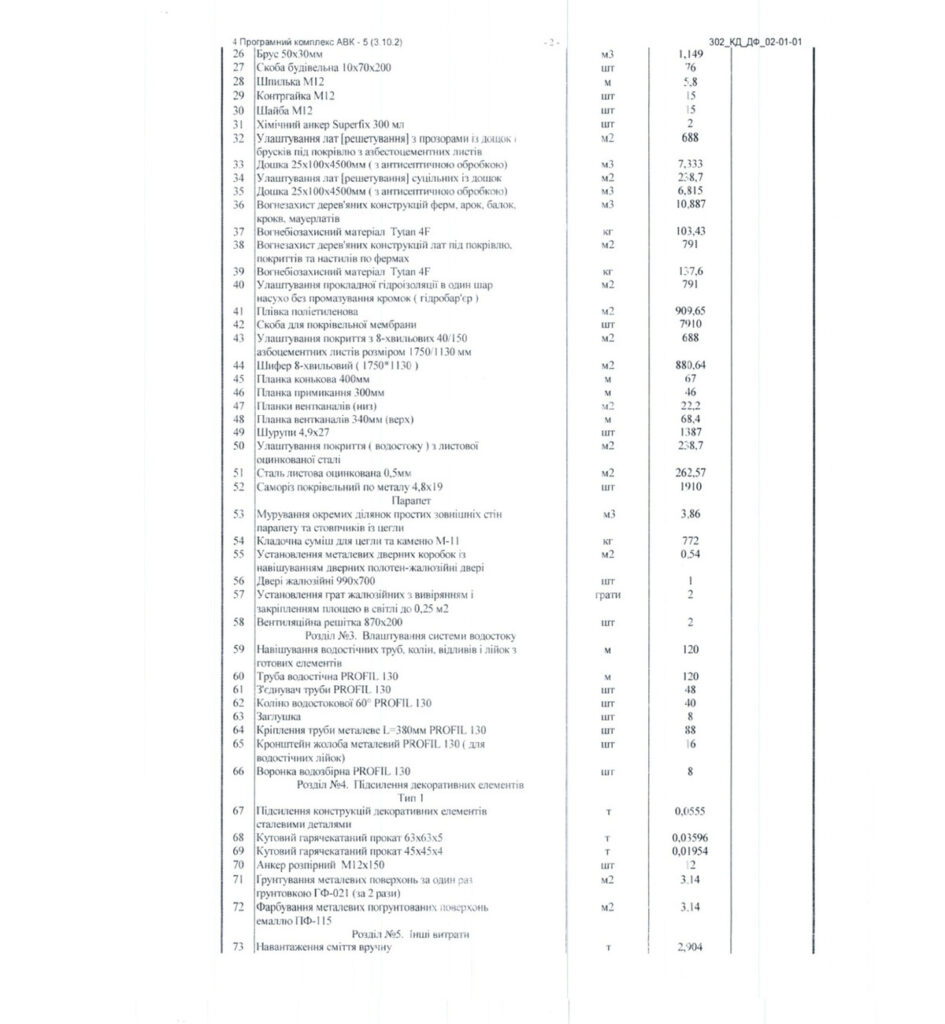 - дах (частина 1) – демонтажні роботи, покрівля, парапет, влаштування системи водостоку, підсилення декоративних елементів, інші витрати (вивезення сміття);