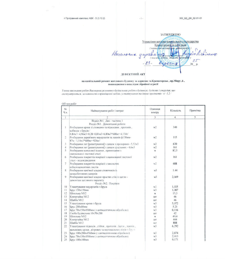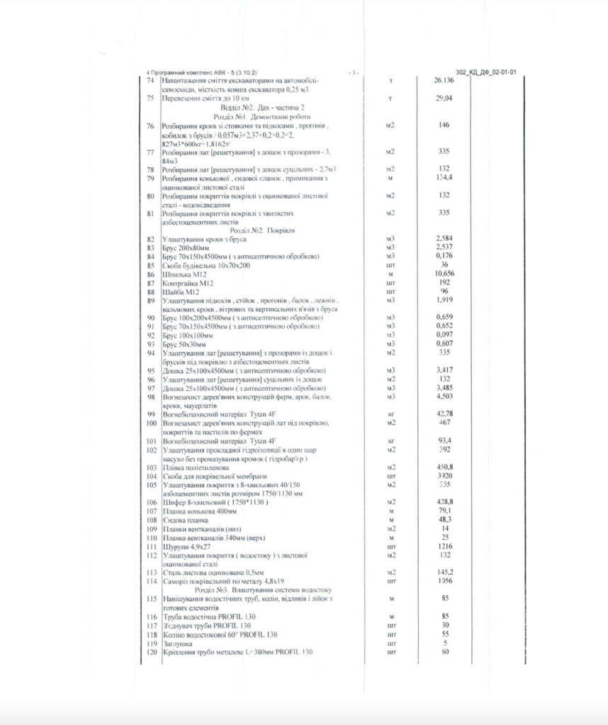 - дах (частина 2) – демонтажні роботи, покрівля, влаштування системи водостоку, інші витрати (вивезення сміття).