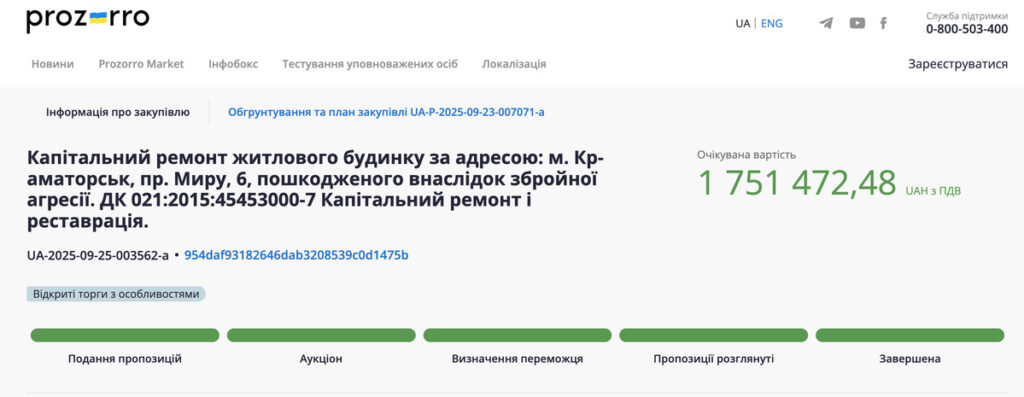 За 1 мільйон 632 тисячі 915 гривень у Краматорську на проспекті Миру, 6 відремонтують будинок, пошкоджений внаслідок атак рф. Роботи підрядник має завершити до 31 грудня 2025 року. За результатами торгів, послуги надає – ТОВ “Управляюча компанія “СБ Комфорт””.