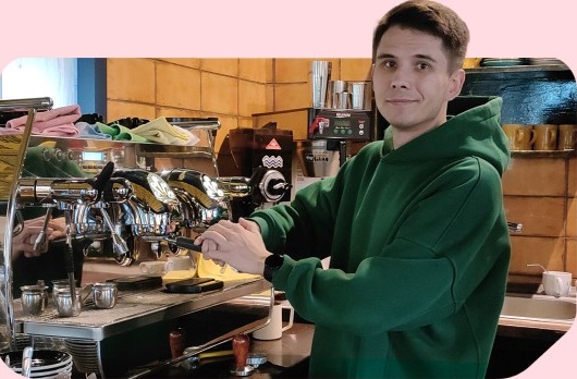 У жовтні до кафе приєднався бариста Олександр — молодий фахівець з інвалідністю, який має досвід, освіту та сильну мотивацію. Він з ентузіазмом працює за кавомашиною та каже, що сучасне обладнання дозволяє йому відчувати себе впевнено і професійно.