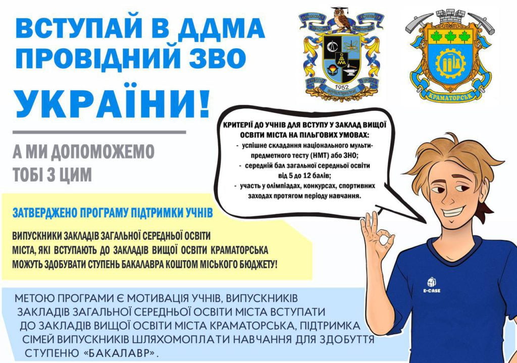 Шановні випускники — з 1-го червня в Краматорську запрацювала програма підтримки учнів міста, за якою Ви тепер маєте змогу за рахунок місцевого бюджету здобути ступінь «Бакалавр» в Донбаській державній машинобудівній академії, повідомляє Краматорська міська рада