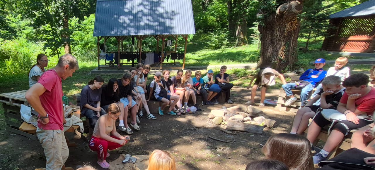 Окрему увагу було приділено демонстрації процесу виготовлення кам’яних знарядь. Діти спостерігали за технікою оббивання креміню, відтиску крем’яних пластин, а згодом власноруч спробували зробити відкол за допомогою спеціально відібраної кам’яної гальки. Кожен учасник отримав набір матеріалів: кремінь, клаптик шкіри для безпечного тримання та інструмент для обробки.