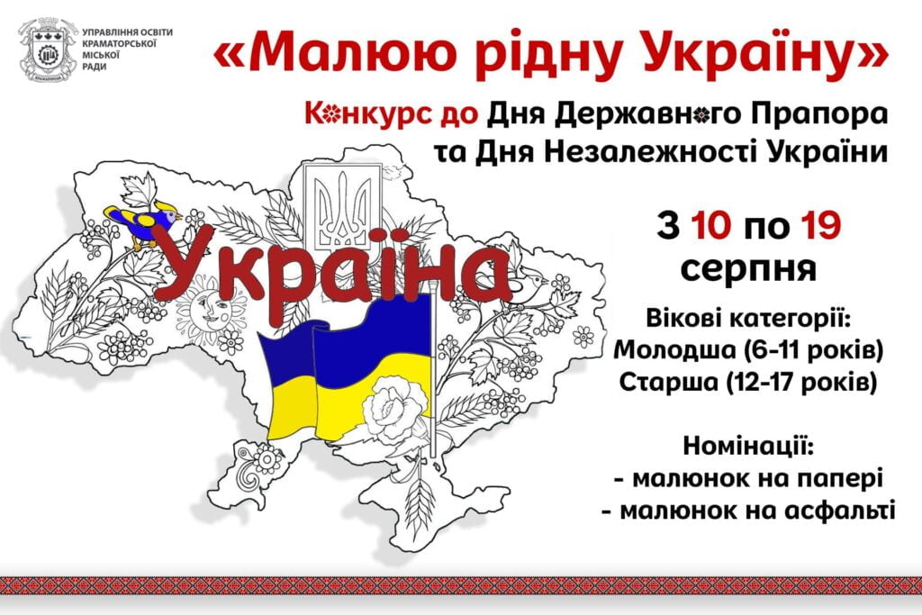 Управління освіти Краматорської міської ради, з нагоди святкування Дня Державного Прапора та Дня Незалежності України оголошує конкурс малюнків. До участі запрошуються учні ЗЗСО міста Краматорська віком від 6 до 17 років.