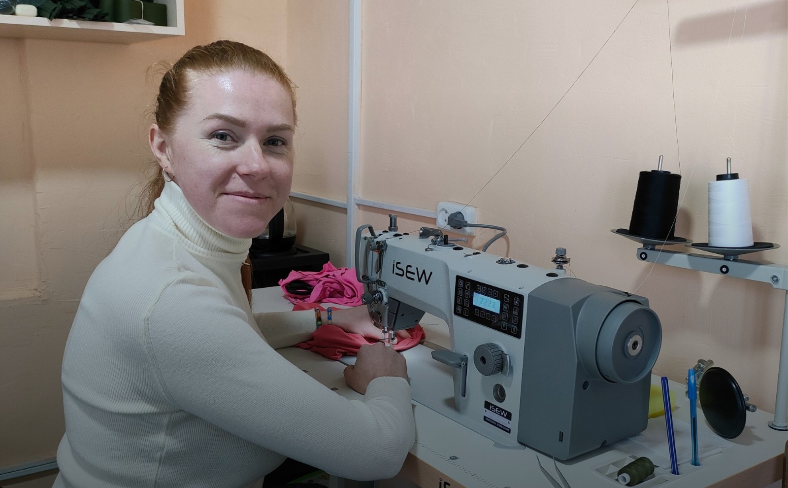 Пані Олена скористалась державною програмою Власна справа/грант. За кошти гранту вона придбала вишивальну машинку, промислову машинку для ремонту одягу, швейну машинку для тонких тканин, оверлок, відпарювач. Також кондиціонер, металеві ролети для безпеки, меблі та інші необхідні речі.