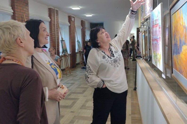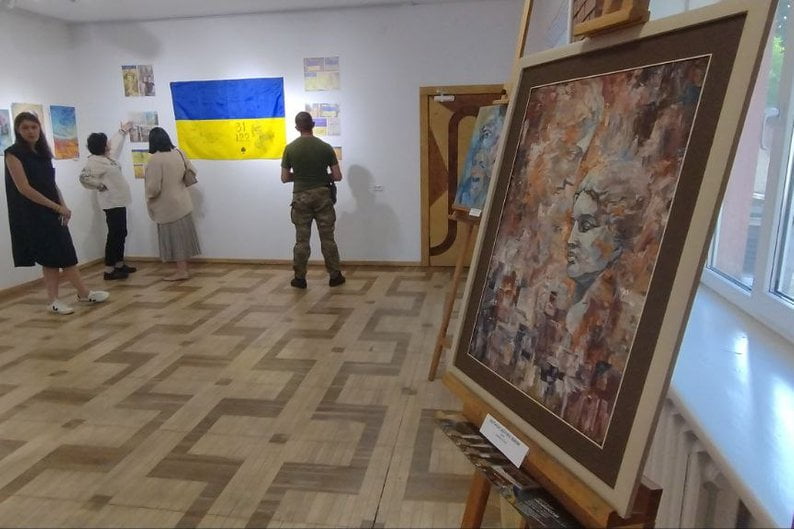 Виставка “Рідні барви 4.5.0” подорожує Україною з листопада 2022 року. Усього вона нараховує 73 роботи — тут і живопис, і фотографії з фронту, і прапор з авторським малюнком художника з Краматорська Донецької області Артура Новікова.