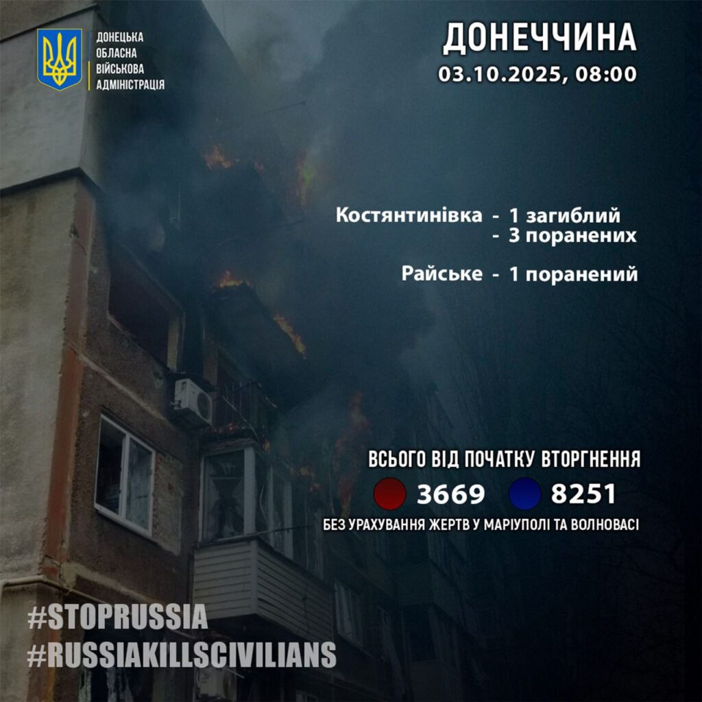 За 2 жовтня росіяни вбили 1 жителя Донеччини: у Костянтинівці.