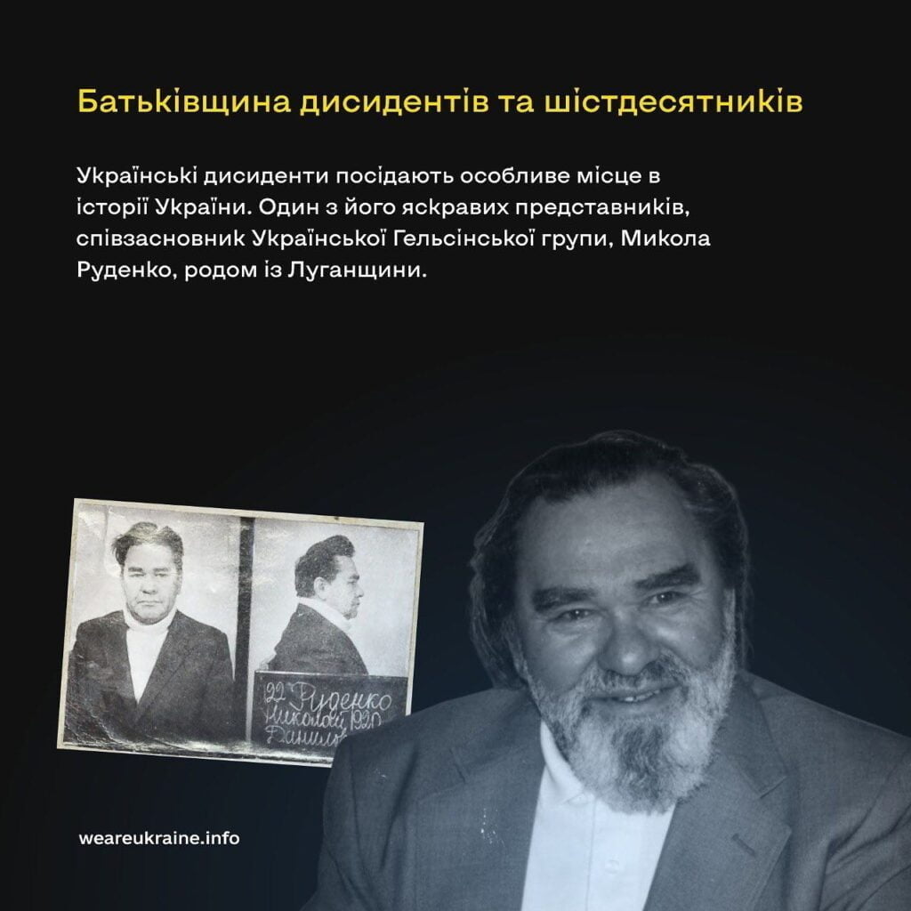Українські дисиденти посідають особливе місце в історії України. Один з його яскравих представників, співзасновник Української Гельсінської групи, Микола Руденко, родом із Луганщини.