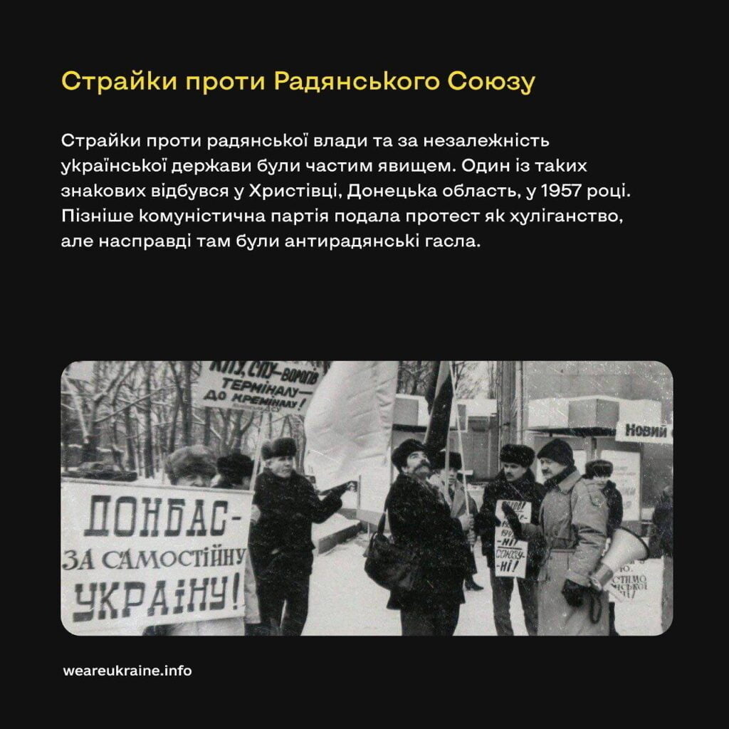 Страйки проти радянської влади та за незалежність української держави були частим явищем. Один із таких знакових відбувся у Христівці, Донецька область, у 1957 році. Пізніше комуністична партія подала протест як хуліганство, але насправді там були антирадянські гасла.
