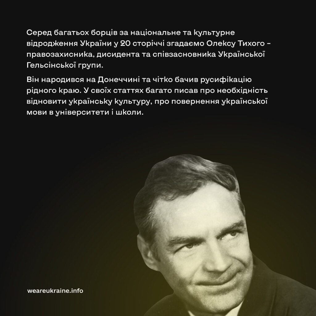 Серед Багатьох борців за національне та культурне відродження України у 20 сторіччі згадаємо Олексу Тихого – правозахисника, дисидента та співзасновника Української Гельсінської групи.