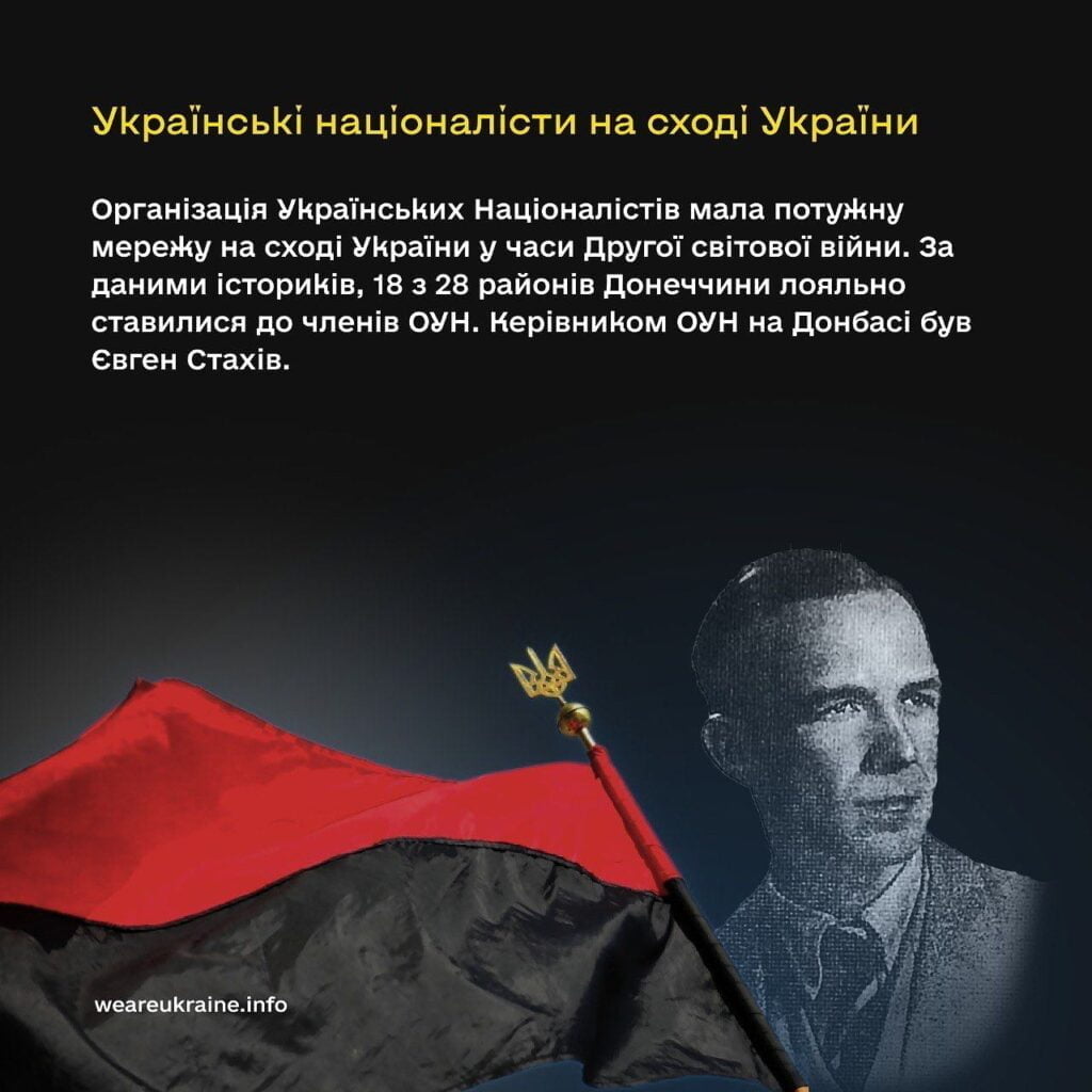 Організація Українських Націоналістів мала потужну мережу на сході України у часи Другої світової війни. За даними істориків, 18 з 28 районів Донеччини лояльно ставилися до членів ОУН. Керівником Оун на Донбасі був Євген Стахів.