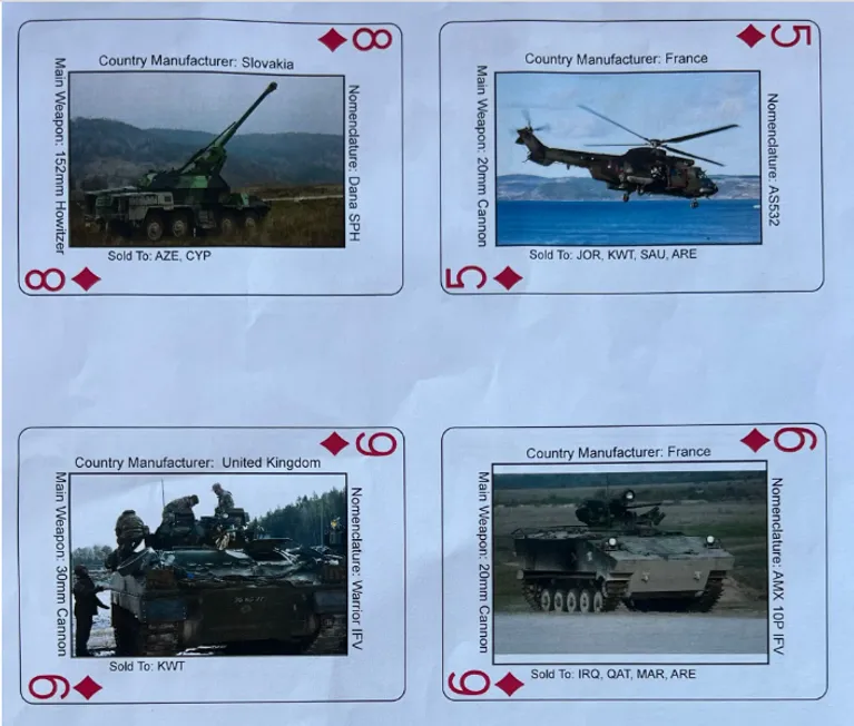 Примітно, що картки можуть ненавмисно схиляти руку державам, які намагалися бути непрозорими щодо зброї. Наприклад, червовим валетом є гелікоптер американського виробництва UH-60 Black Hawk, один з яких є в української військової розвідки. Щоправда, про отримання цієї техніки фактично офіційно не оголошували.