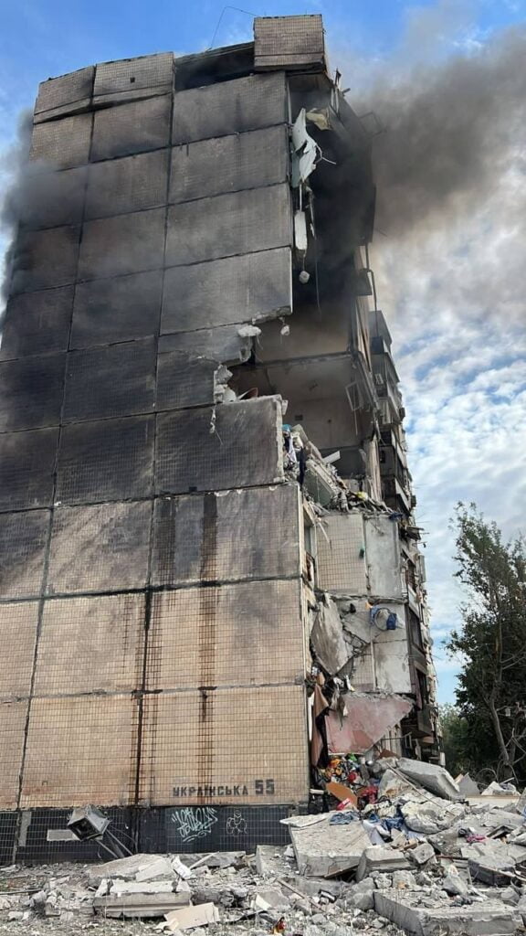 Друга ракета зруйнувала секцію з 4 по 9 поверхи житлового будинку. Виникла пожежа. Станом на 10:15 одна людина загинула, за медичною допомогою звернулося 10 мешканців. Надзвичайники гасять вогонь та розбирають завалами. Там ще можуть бути люди», – написав Клименко.