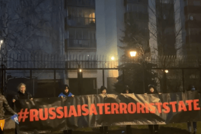 Активісти розгорнули великий банер з хештегом #russiaisaterroriststate та увімкнули звуки, що нагадують сирени повітряної тривоги та бомбардування.