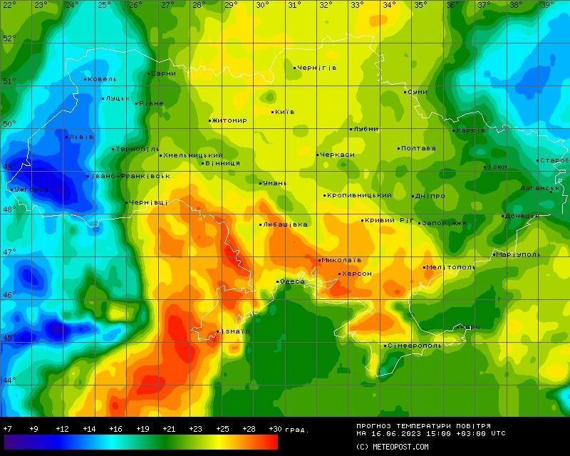 На заході буде похолодання до +17+22 градусів, у Хмельницькій та Тернопільській області буде трохи вищим – +20…+24 градуси. На півдні температура повітря буде +24…+29 градусів, на сході – +22…+25 градусів, на півночі та в центрі – +23…+27 градусів.